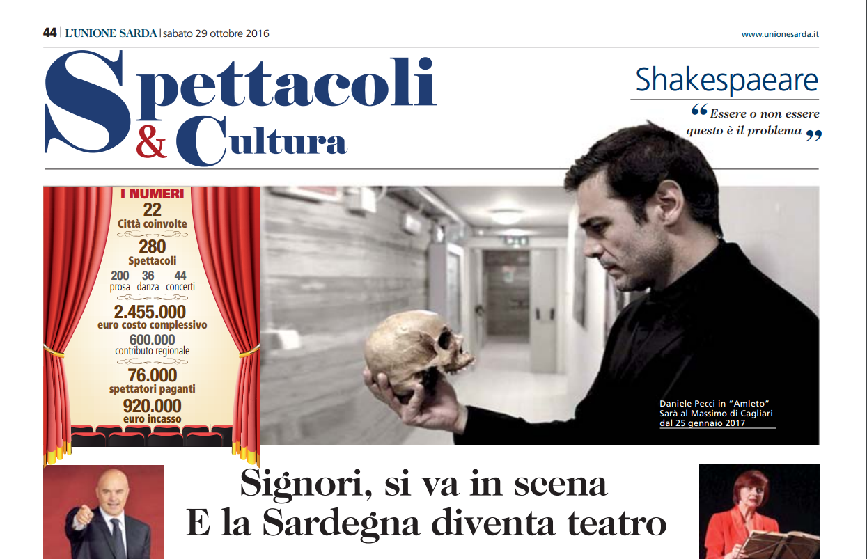 Su il sipario dunque sulla Stagione 2016-17 , con un intrigante cartellone in cui spiccano i grandi nomi della scena italiana e non solo accanto alle stelle della danza e della musica classica e jazz, sui palcoscenici di oltre 20 teatri e città della Sardegna – da Cagliari a Sassari, da Carbonia a Nuoro, da Olbia a Meana Sardo. Sono poco meno di 200 le recite in programma da novembre a maggio, cui si aggiungono 36 concerti di musica classica e jazz e 26 appuntamenti con la danza classica e contemporanea oltre a una stagione di Teatro Ragazzi calibrata sulle diverse fasce d’età.